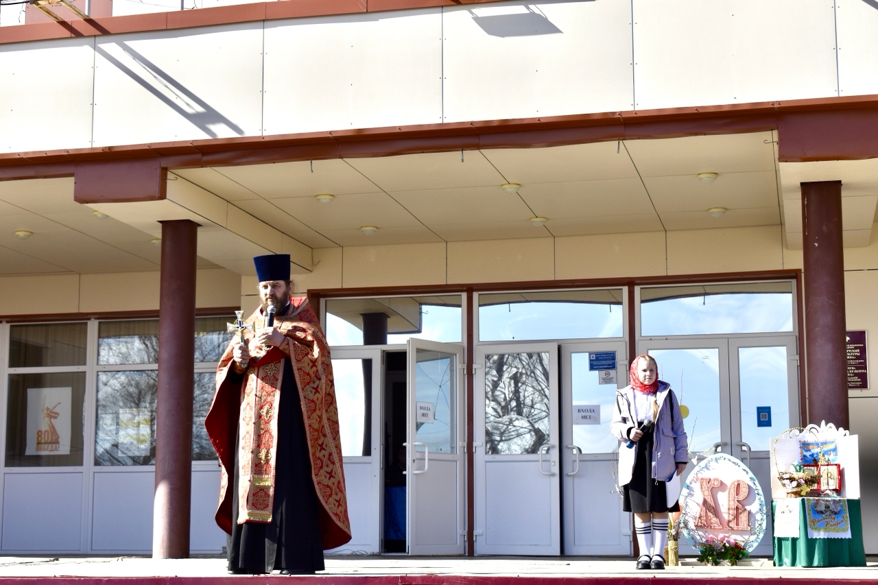 На сцене возле Дома культуры «Дружба» отец Стефан поздравил всех присутствующих с этим радостным днем и окропил присутствующих святой водой.