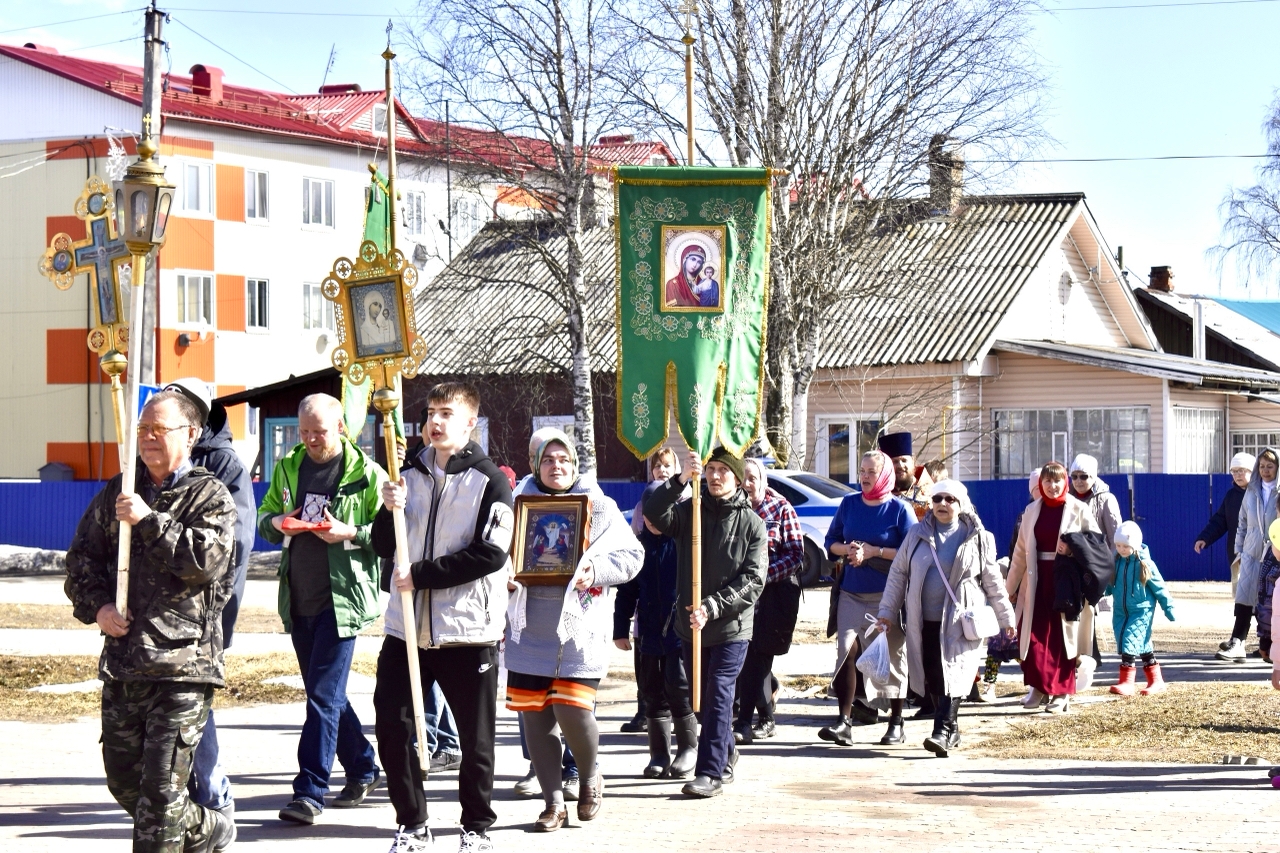В воскресенье ближе к полудню православные верующие снова собрались у храма. Под радостный перезвон колоколов крестный ход обошёл храм. Затем колонна верующих всех возрастов в удивительно светлой и радостной атмосфере, под воодушевляющие песнопения, прошла по посёлку. Прихожане Свято-Ильинского собора во главе с отцом Стефаном проследовали пасхальным шествием к Дому культуры, чтобы разделить со всеми радость великой Пасхи Христовой.