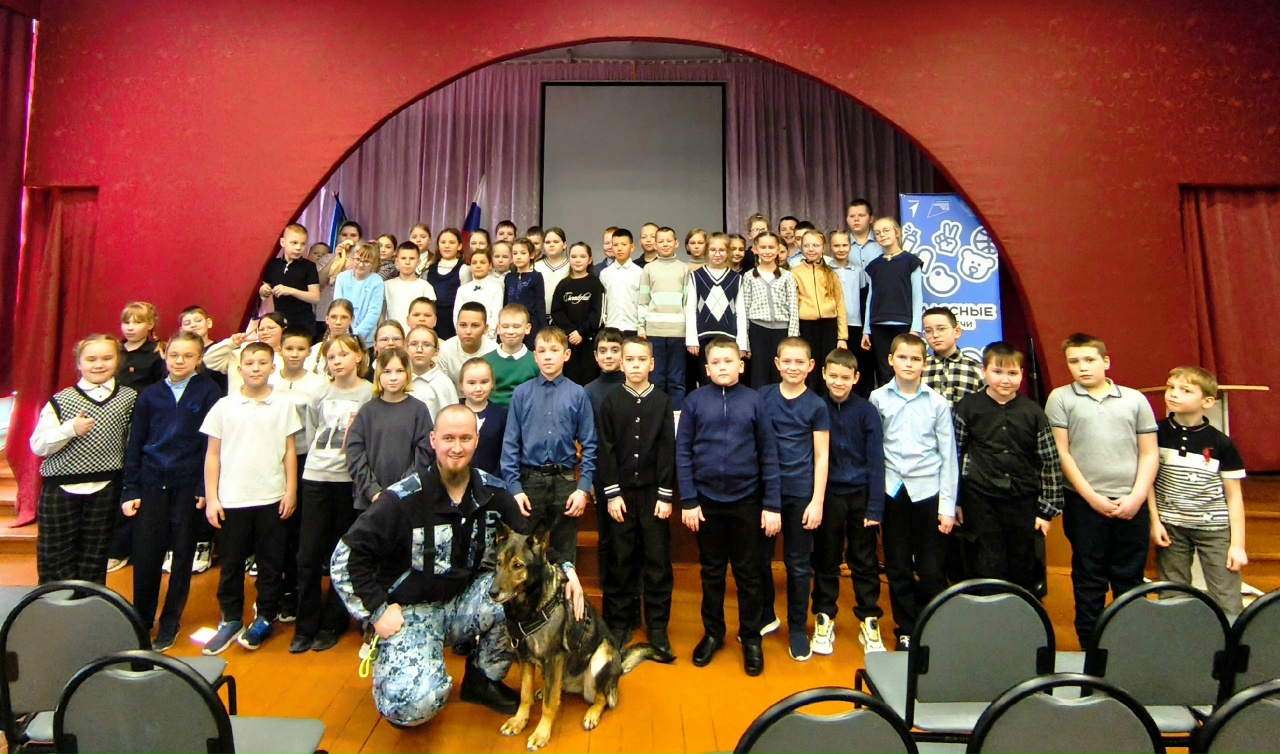 На встречу с учащимися школы пришёл старшина полиции Виталий Коньков вместе со своим напарником Халвой.