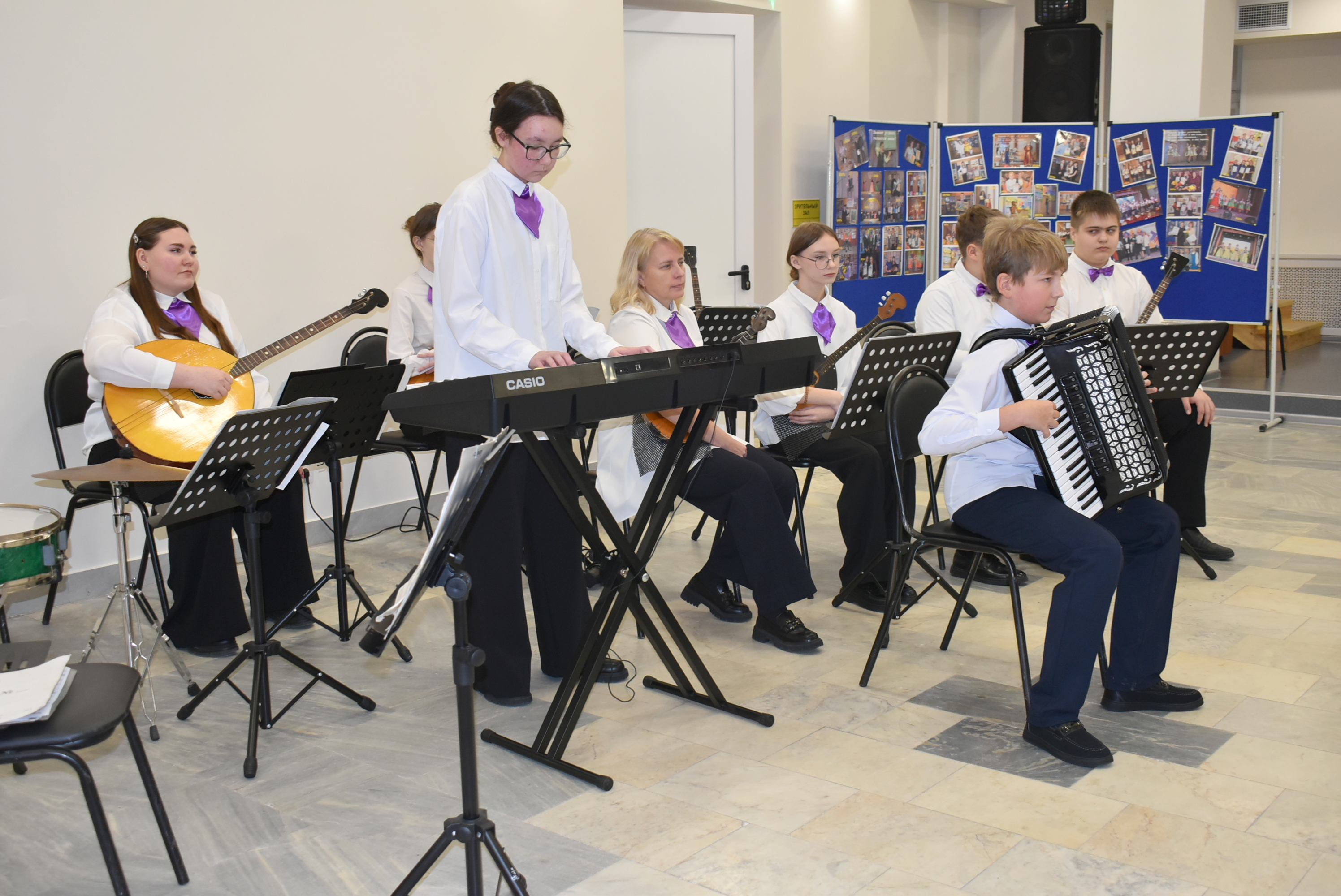 Ещё до начала праздничного концерта участники и гости мероприятия окунулись в атмосферу творчества. Фойе наполняли мелодии оркестра русских народных инструментов Детской школы искусств г.Микунь.