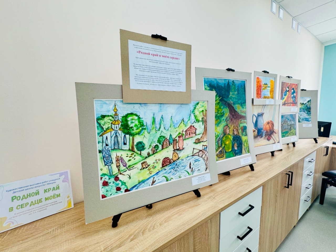 Сейчас в этом зале проходит выставка «Родной край в моём сердце». На картинах, созданных учениками школы искусств города Микунь, запечатлены родные пейзажи и мотивы.