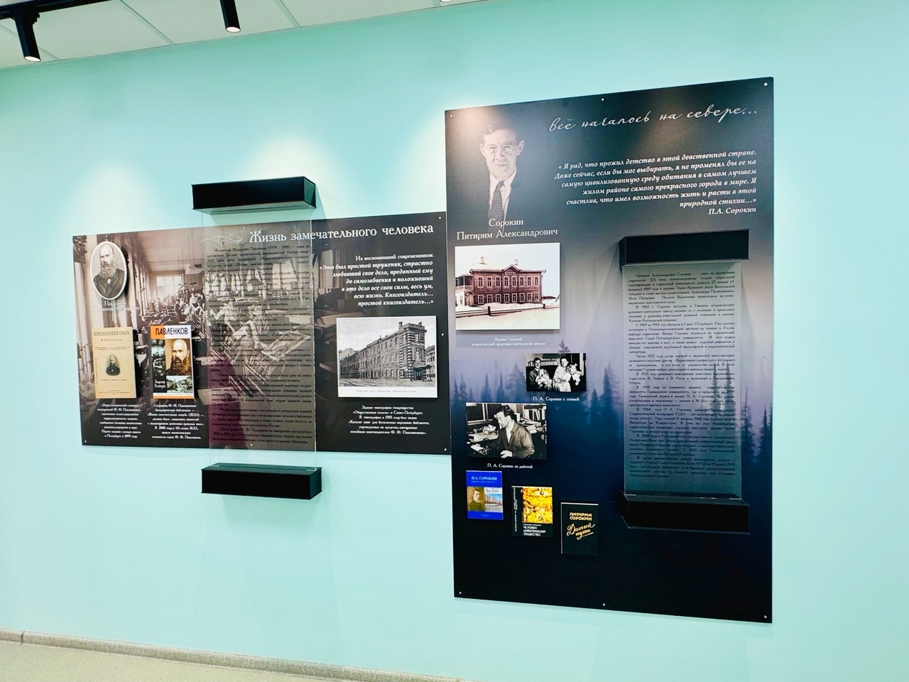 История библиотеки в селе Айкино связана с двумя именами: Флорентием Павленковым и Питиримом Сорокиным. Об этом подробно рассказано на стенде в фойе.