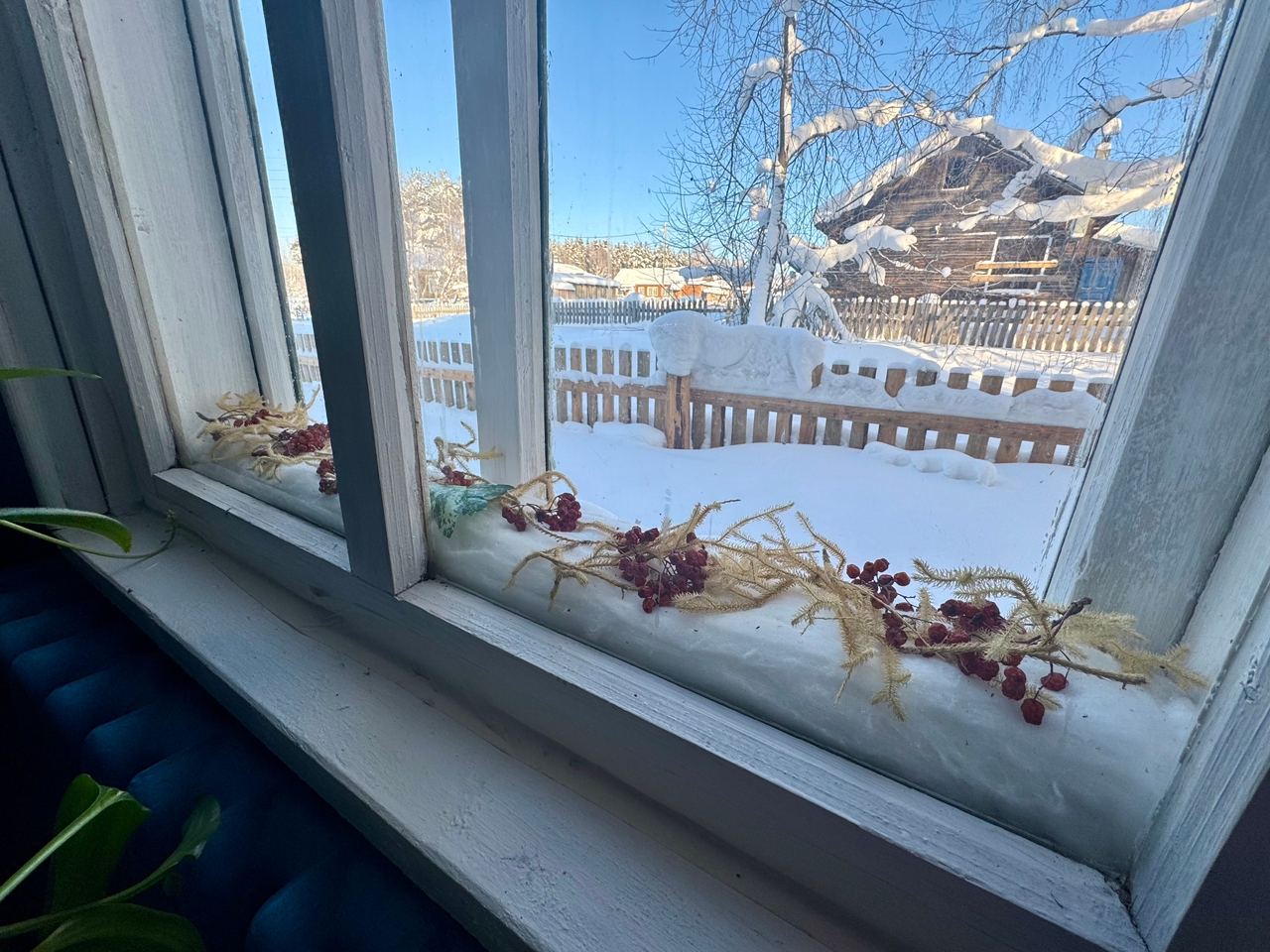 Пространство между новыми деревянными рамами заполнено веточками рябины, мхом и ватой. Это решение помогает удерживать влагу, предотвращает сквозняки и добавляет ощущение тепла и комфорта.