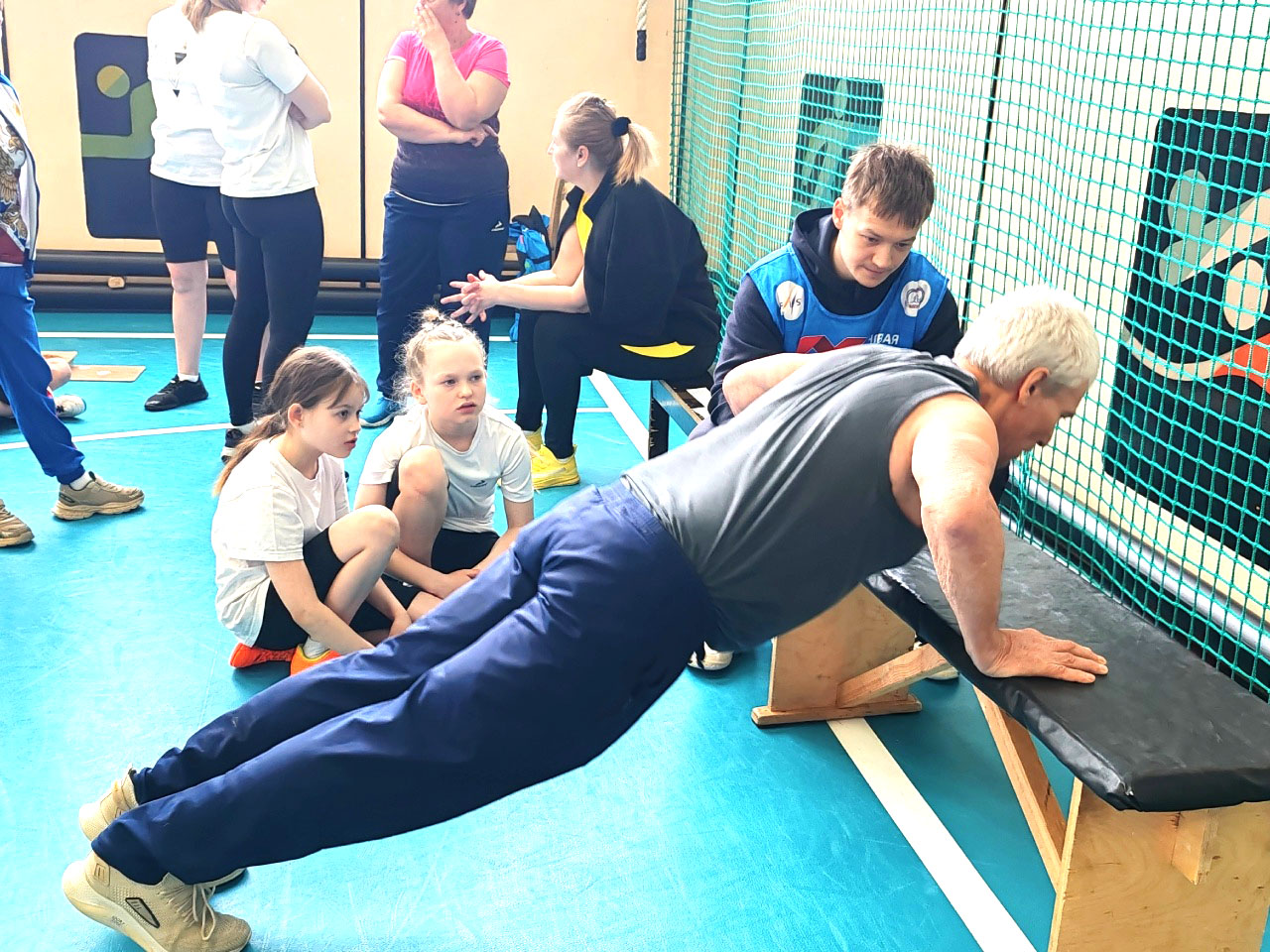 Участники достойно прошли все испытания: наклоны вперёд, подъём туловища, прыжки в длину, сгибание и разгибание рук, подтягивания на перекладине.